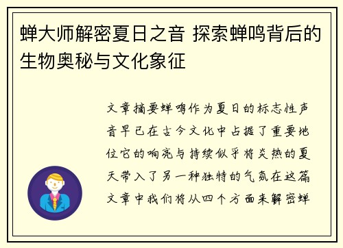 蝉大师解密夏日之音 探索蝉鸣背后的生物奥秘与文化象征